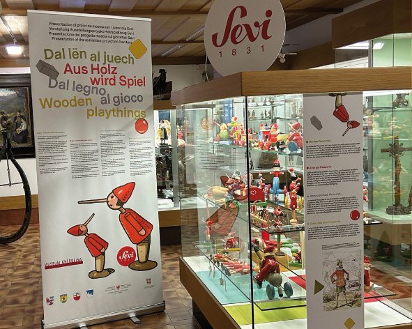 Die Familie Senoner Vastlé hat im April 2023 ihre Mustersammlung der Sevi Kollektionen dem Museum Gherdëina übergeben. Sie reicht von den 1930er bis zu den 1990er Jahren und umfasst 8000 Objekte. Ab Weihnachten 2025 wird in diesem Saal eine schöne Auswahl davon zu sehen sein. Die Ausstellung will Erinnerungen wecken und Entwicklungen aufzeigen. Und: Sie lädt Jung und Alt zum Spielen ein! Die Figur des Pinocchio ist hierfür Botschafter, denn sie war in all den Jahren dabei.