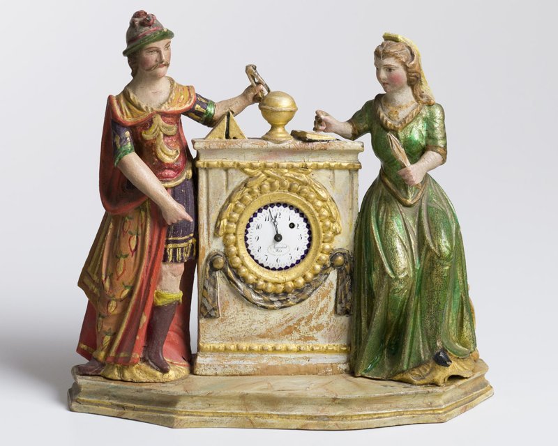 Das am meisten verbreitete Motiv auf diesen mit ornamentalem oder figuralem Schnitzwerk geschmückten Ständern bezieht sich auf die allegorische Darstellung der Zeit, auf Chronos und Kronos/Saturn. Aber auch andere mythologische Gestalten wie jene von Merkur, Minerva und Hermes finden sich im Figurenwerk vor.