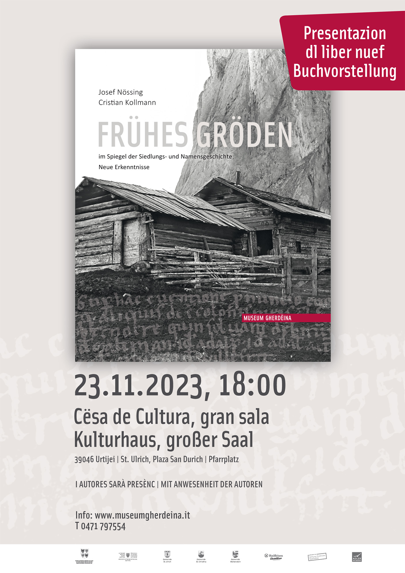 L liber “Frühes Gröden” de Josef Nössing y Cristian Kollmann unirà dat ora dal Museum Gherdëina d’autonn 2023. L ie l resultat de ani de tuedes sotes, pra chëles che i doi studiëusc à ejaminà a puntin la storia dl nridlamënt tla valeda y l senificat di plu vedli inuemes de mejes y dl raion de Gherdëina.