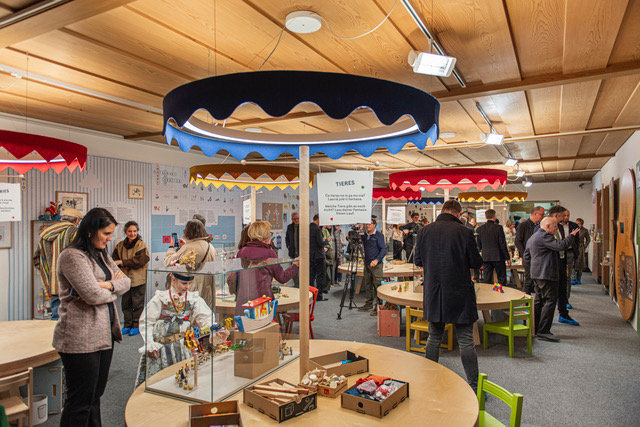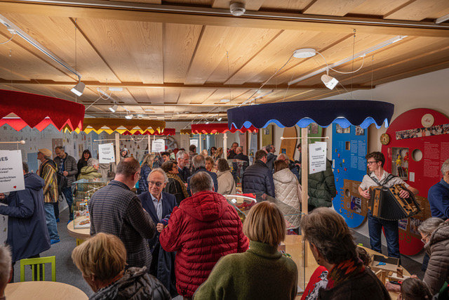Inaugurazion dla mostra nueva di juesc dla Sevi, 4.12.2025. Da man drëta a man ciancia: diretëures dla Repartizion innuvazion, nrescida, università y museums Franz Schöpf y Manuel Gatto, diretëur dla Repartizion cultura ladina Mathias Stuflesser cun assessëur Daniel Alfreider, diretëura dl museum Paulina Moroder y presidënt Georg Senoner, ambolc de Urtijei y Santa Cristina Tobia Moroder y Christoph Senoner